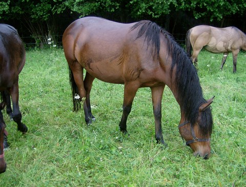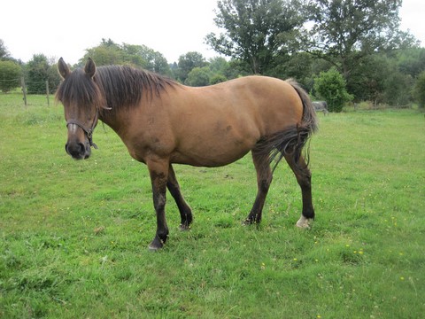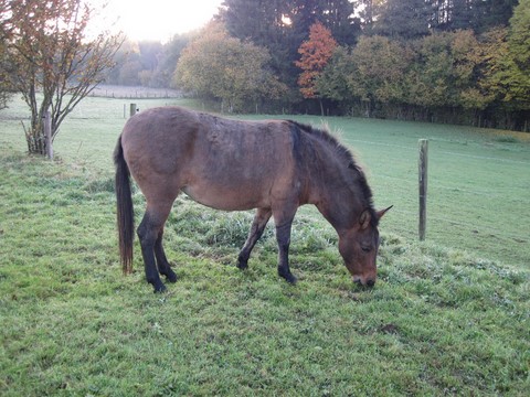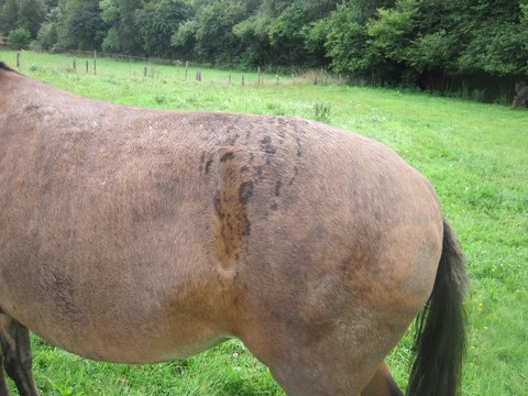 Ma robe est ...disons.... très spéciale : je suis alezane cuivrée, avec une raie dorsale, une raie cruciale "diluée" et des zébrures sur les jambes et sur le flanc gauche.