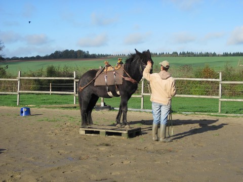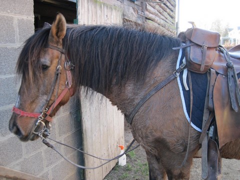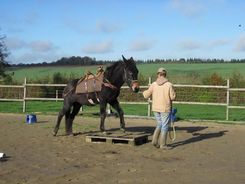 Je suis débourrée au bât et aux caisses de bât, j'accepte un cavalier sur le dos mais je ne travaille pas (encore) sous la selle car le but premier de Joe était que je ne porte que les bagages.