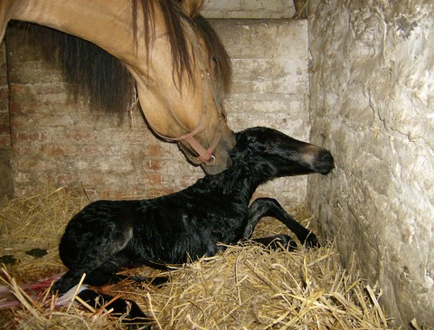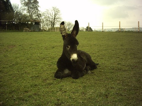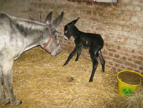 Ma maman est une PRE (Pure Race Espagnole). Mon histoire est un peu différente de celle des ânes. Ma maman a été recueillie alors qu'elle partait pour l'abattoir. Pili, la personne qui l'a rachetée inextremis savait qu'elle était pleine d'un bel étalon "gris fer". Pili s'attendait à voir naître un petit poulain. Mais quelle surprise en voyant mes grands oreilles.... Elle m'a donc appelé Maldone (avec un N, j'insiste !) .