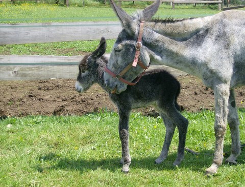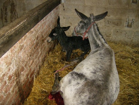 Ma maman ne me laissait pas boire. Elle faisait mine de vouloir me mordre et me frapper. Elle ne me faisait pas mal mais j'avais très peur. Après 4 heures d'observation, Joe a trait le colostrum (le premier lait) et me l'a administré avec 2 petits biberons. Très vite, cela m'a donné de l'énergie. Durant quelques jours, Joe surveillait Léo, lui tenait un pied afin que je puisse boire tranquillement. Au bout d'une semaine, Léo m'a bien accepté et tout est rentré dans l'ordre. Aujourd'hui, je suis le plus costaud de tous les ânes du troupeau.