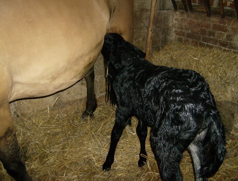 À 7 mois, j'étais encore un bébé et c'était difficile pour moi de ne plus avoir de maman. Le hasard de la vie fait que, dans le troupeau, Gribouille a le même âge que moi. Et comme je suis une mule intelligente, j'ai discrètement été voler le lait de Gribouille chez Kamel (la maman de Gribouille). Kamel n'était pas contente au début mais elle m'a vite acceptée et m'a nourrie durant plusieurs mois.