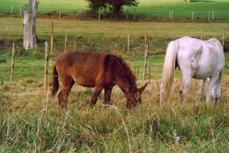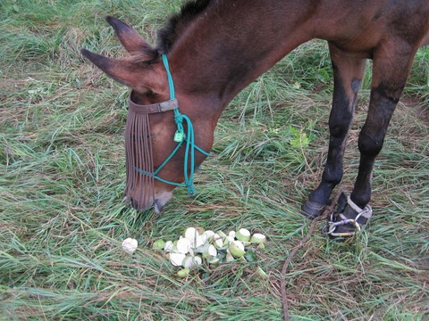 J'ai tout le temps faim ou envie de manger. Parfois, je fais le singe dans la gamelle ou encore je triche et change de pré pour avoir de la meilleure herbe. Mais si Joe me voit, je reviens vite vers elle et me laisse me remettre dans le pré d'origine sans discuter.
