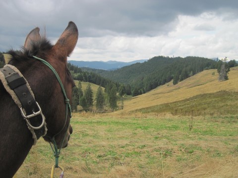 Je suis une mule. Ma maman est un cheval et mon papa est un âne (le fameux "bel étalon gris fer"). Je ne suis pas têtue. Je suis une bonne mule au travail. Je voyage beaucoup avec Joe. Je porte les bagages lors des randonnées mais je ne suis pas montée par les enfants car je suis tellement sensible que Joe craint que si un enfant fait le fanjo sur mon dos, je réagisse un peu trop vivement. Donc, le bât oui, la selle non.