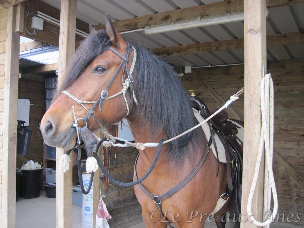 Je suis débourrée au bât et aux caisses de bât, j'accepte un cavalier sur le dos mais je ne travaille pas (encore) sous la selle car le but premier de Joe était que je ne porte que les bagages.