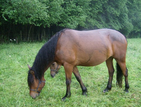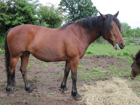 Ma robe est baie : mon poil est brun-cerise et mes crins sont noirs.