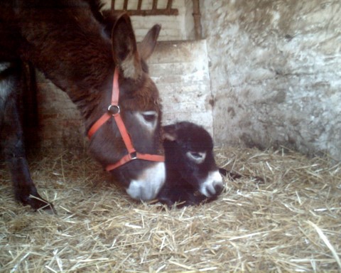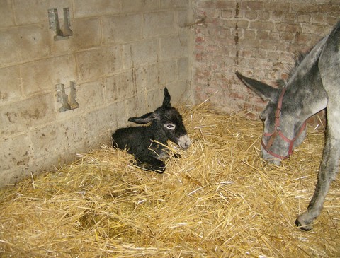 Ma maman ne me laissait pas boire. Elle faisait mine de vouloir me mordre et me frapper. Elle ne me faisait pas mal mais j'avais très peur. Après 4 heures d'observation, Joe a trait le colostrum (le premier lait) et me l'a administré avec 2 petits biberons. Très vite, cela m'a donné de l'énergie. Durant quelques jours, Joe surveillait Léo, lui tenait un pied afin que je puisse boire tranquillement. Au bout d'une semaine, Léo m'a bien accepté et tout est rentré dans l'ordre. Aujourd'hui, je suis le plus costaud de tous les ânes du troupeau.