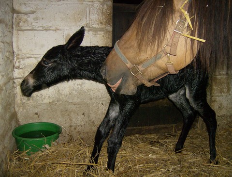 Ma maman est une PRE (Pure Race Espagnole). Mon histoire est un peu différente de celle des ânes. Ma maman a été recueillie alors qu'elle partait pour l'abattoir. Pili, la personne qui l'a rachetée inextremis savait qu'elle était pleine d'un bel étalon "gris fer". Pili s'attendait à voir naître un petit poulain. Mais quelle surprise en voyant mes grands oreilles.... Elle m'a donc appelé Maldone (avec un N, j'insiste !) .