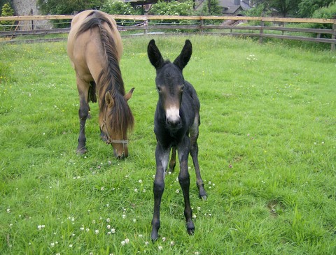 Afin de voir ce que mon papa donnerait comme caractère, Joe a choisi de me laisser entier au milieu du troupeau et de m'observer. Son but étant de faire plus tard une mule avec mon papa et Kamel. Cette mule est née et s'appelle Kamina. C'est donc ma demi-soeur.